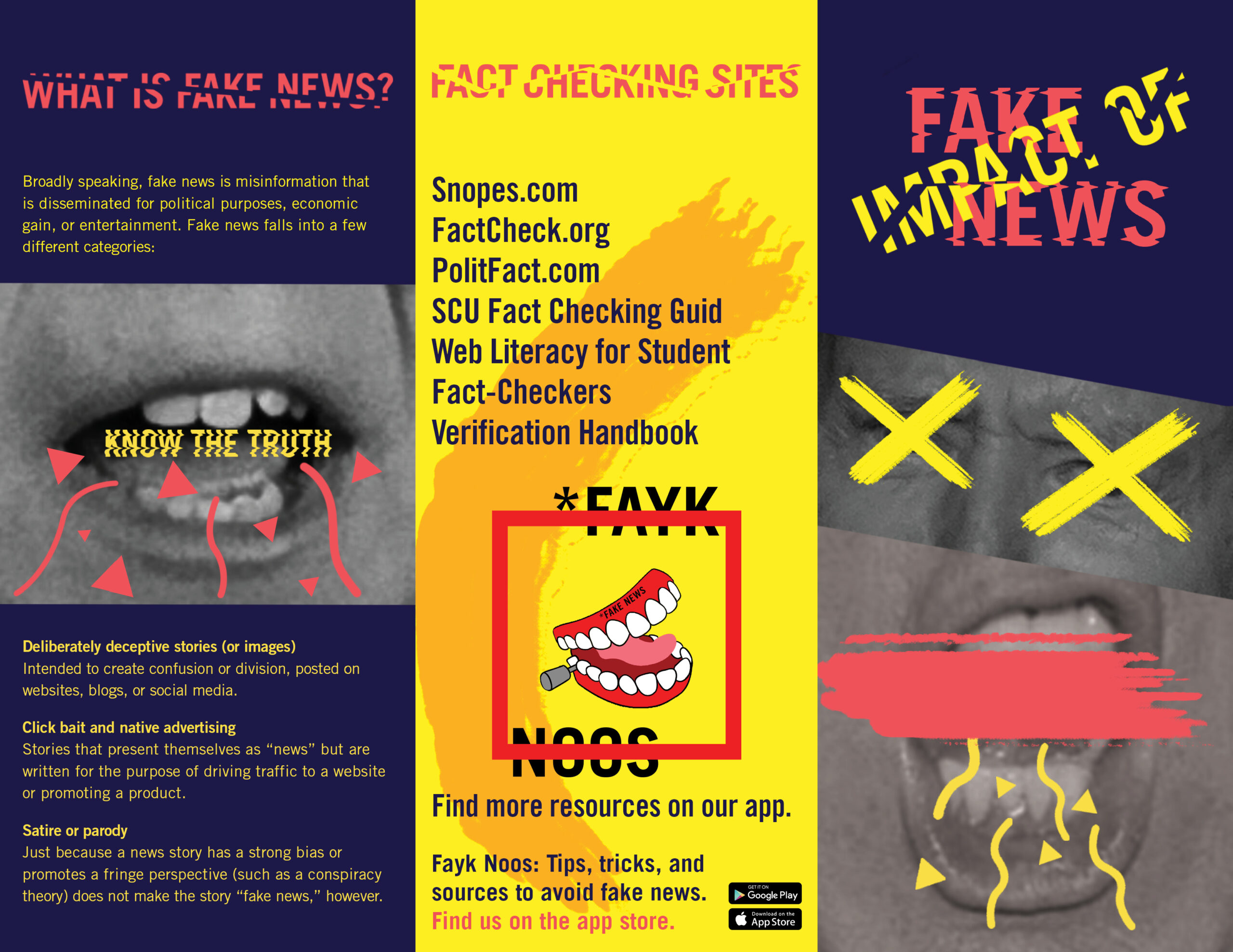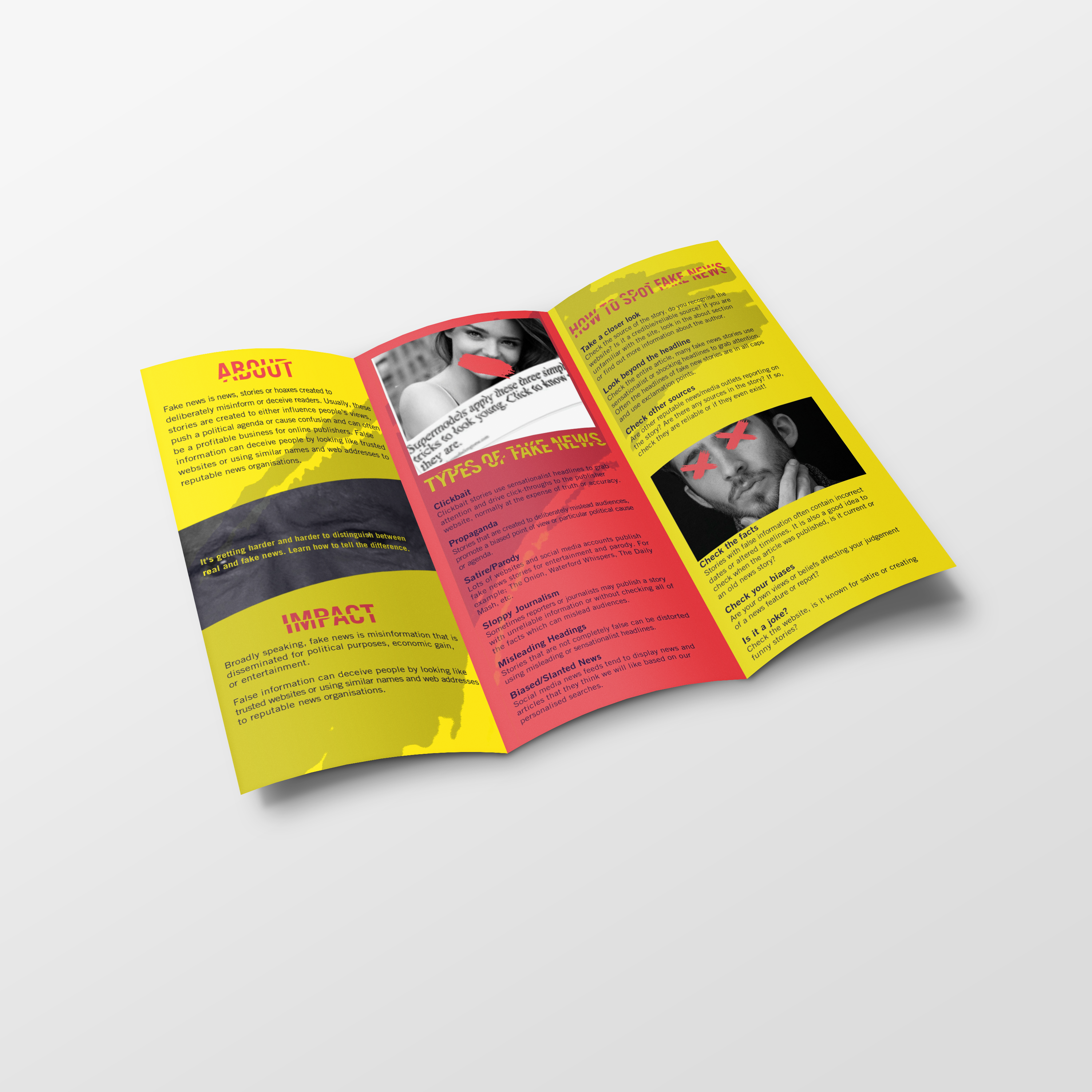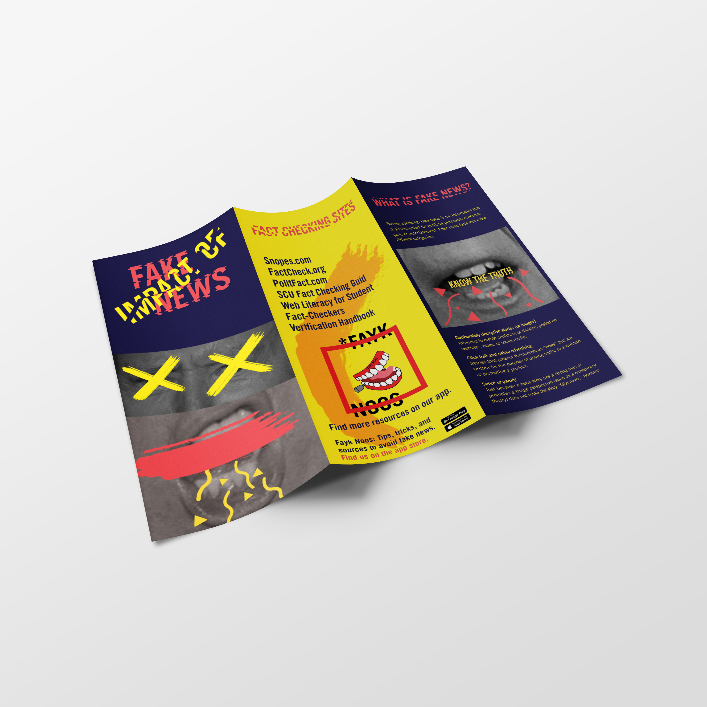 The topic I decided on was fake news. The topic has gained traction over the last few years but it has existed long before that. With such conflict and frustration on the topic, I wanted my design to be loud and immediately grab one’s interest. Therefore, my visual system used a bright and bold color scheme and dynamic visual elements.